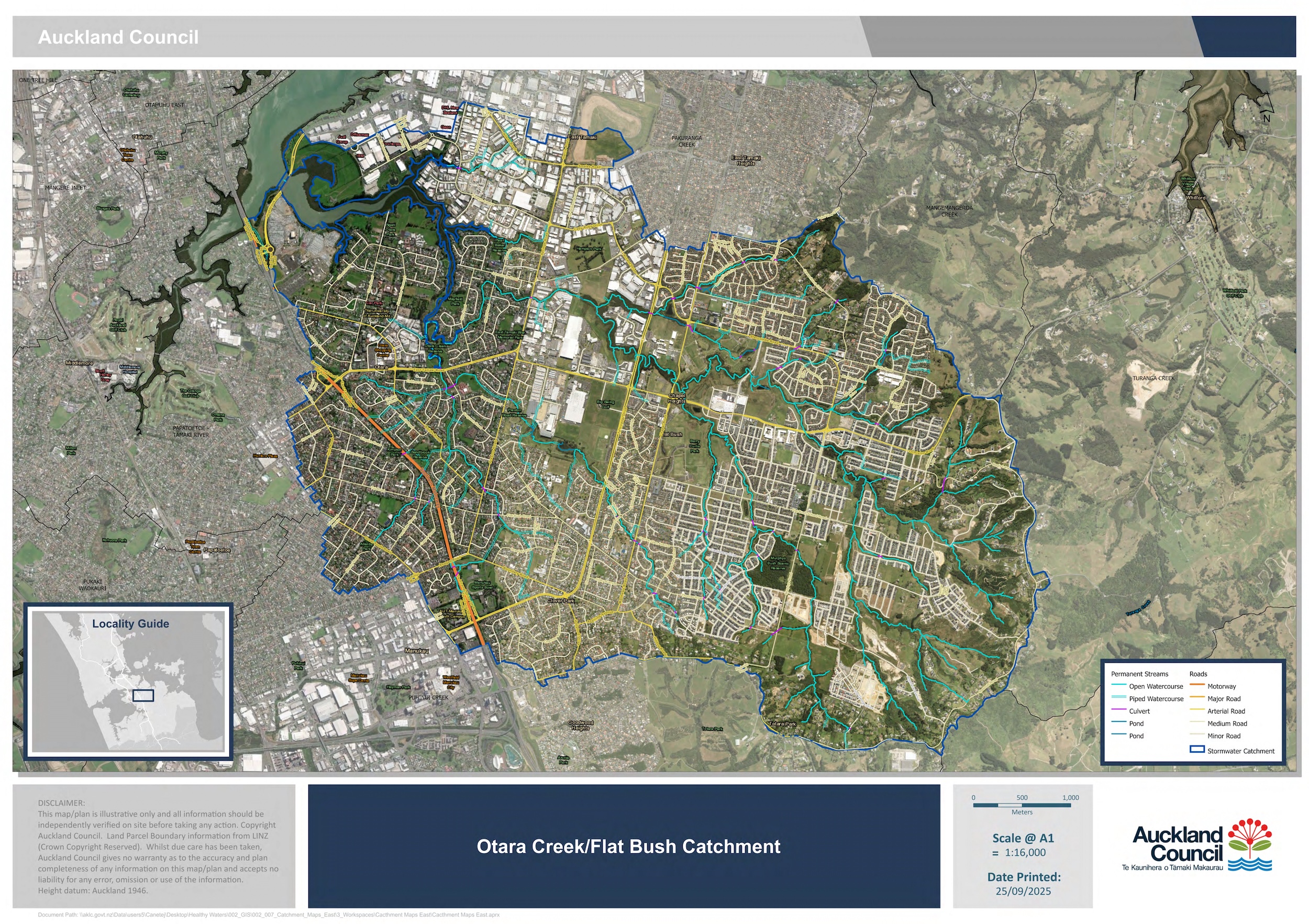 Although it is easy to miss, there are 196.7km of open waterways that run downhill from Redoubt Road. These tributaries carry around 45 billion litres of rainfall across the neighbourhoods of Flat Bush, Ormiston and Ōtara finally feeding into Ōtara Lake, a man-made tidal arm of the Tāmaki Estuary.